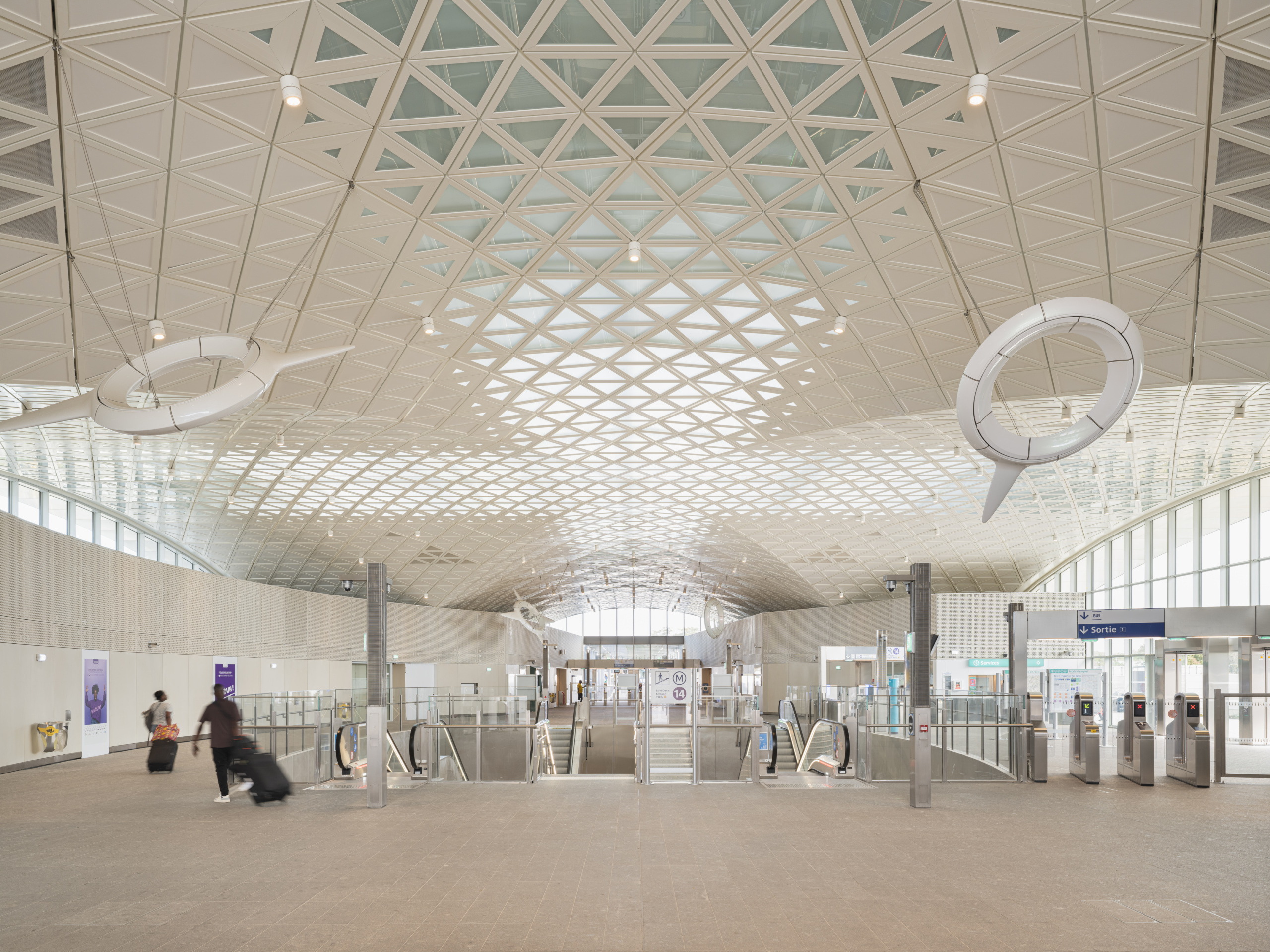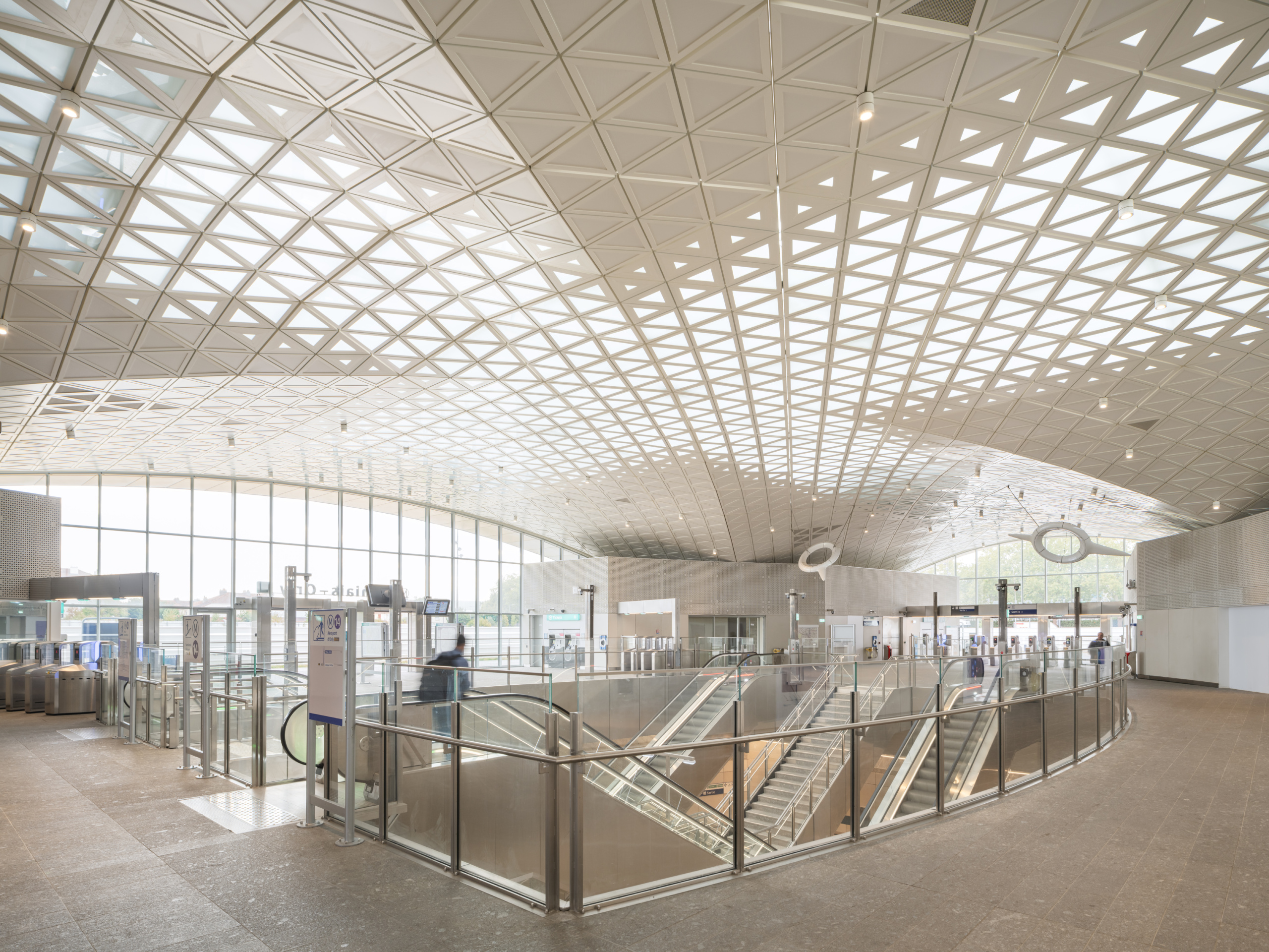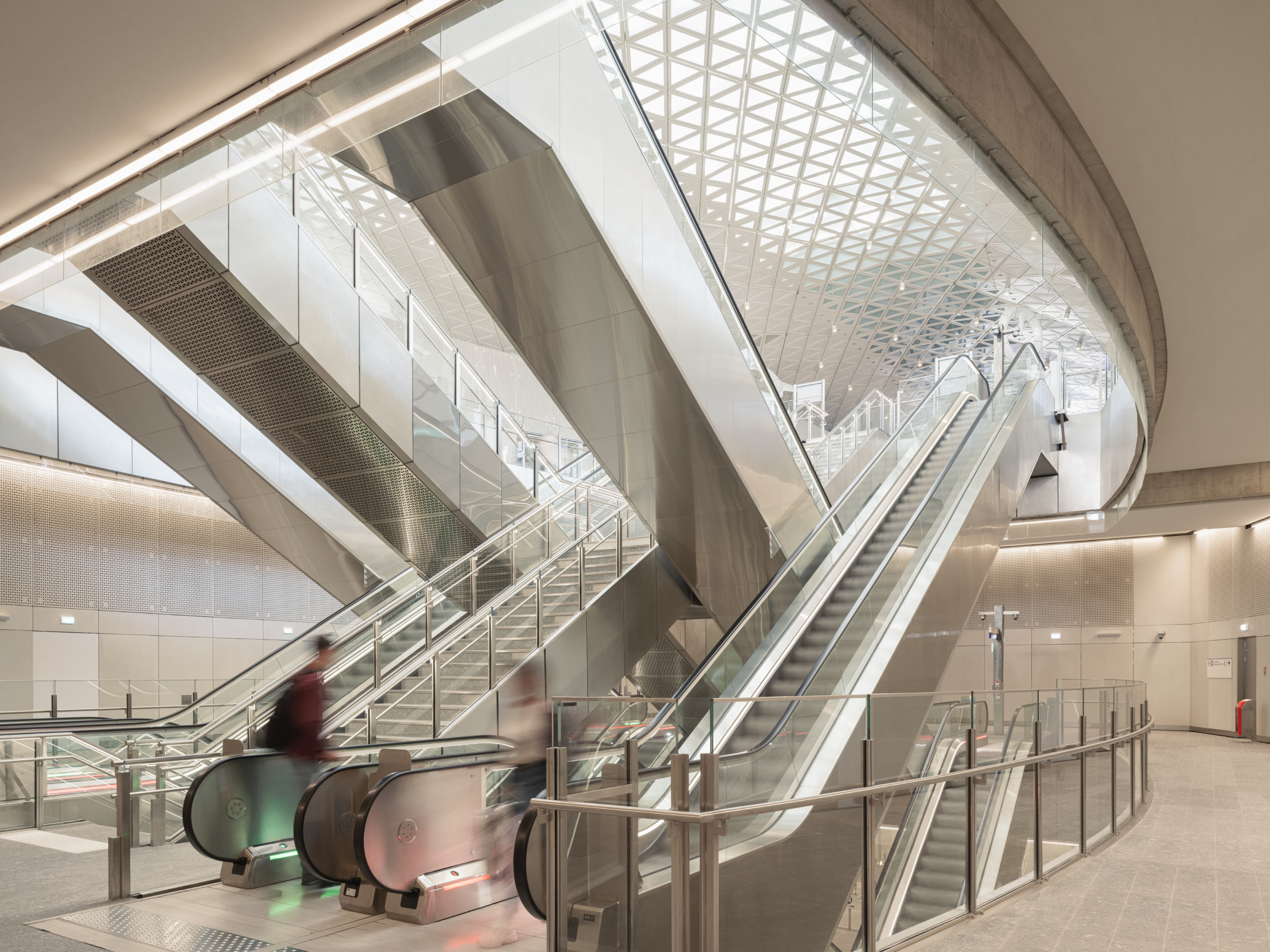 Ce dispositif permet de faire pénétrer la lumière du jour dans les profondeurs de la gare. Cet éclairage naturel accompagne ainsi le mouvement des escalators superposés en acier et verre qui rejoignent les quais de la gare situés en contrebas. L’ascension et la descente deviennent ainsi une véritable expérience pour les usagers.